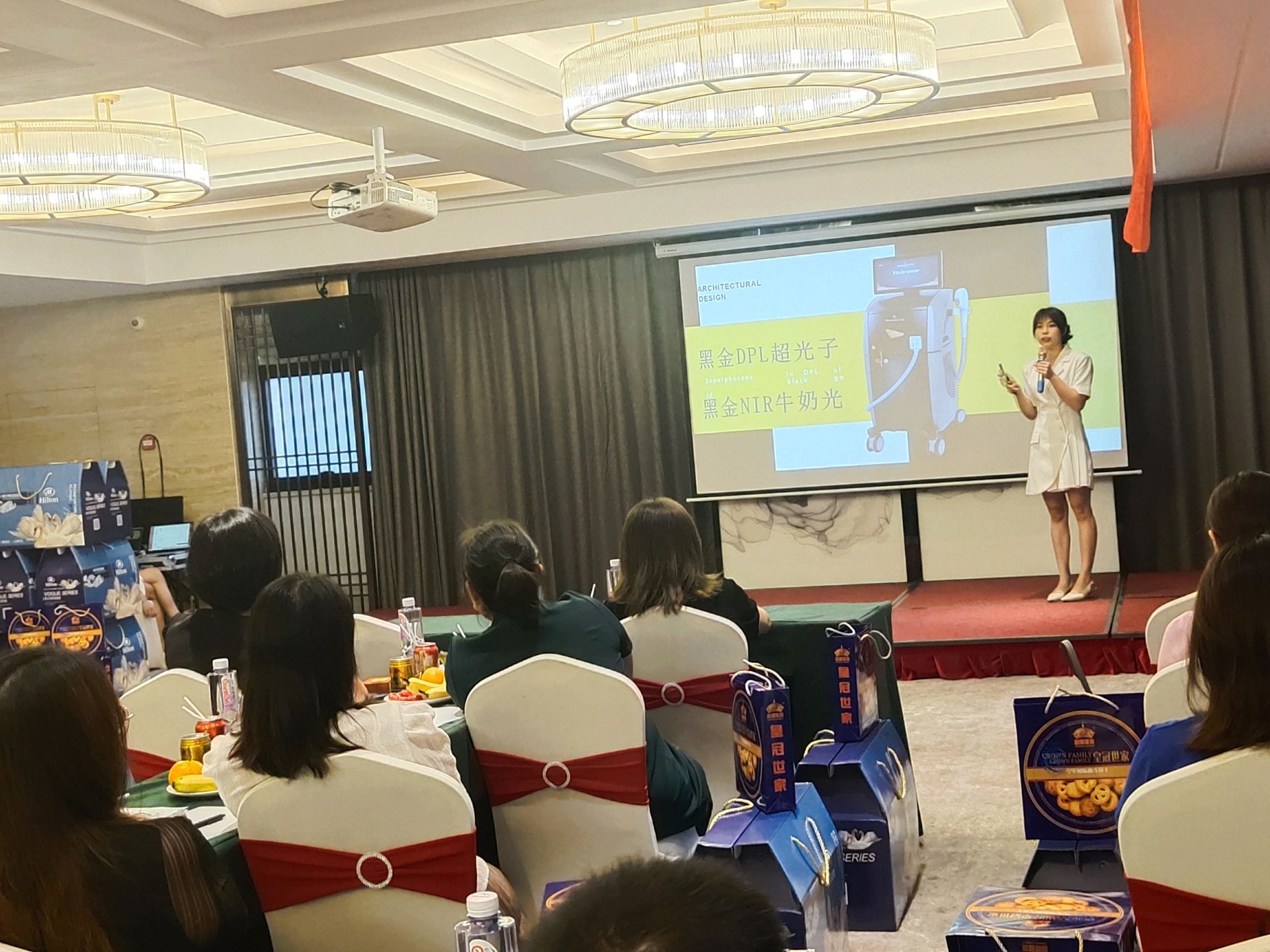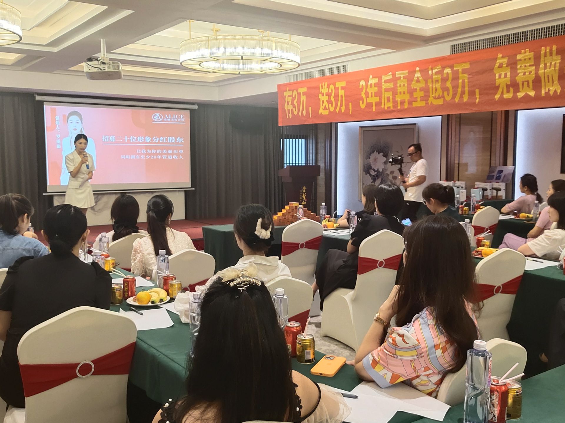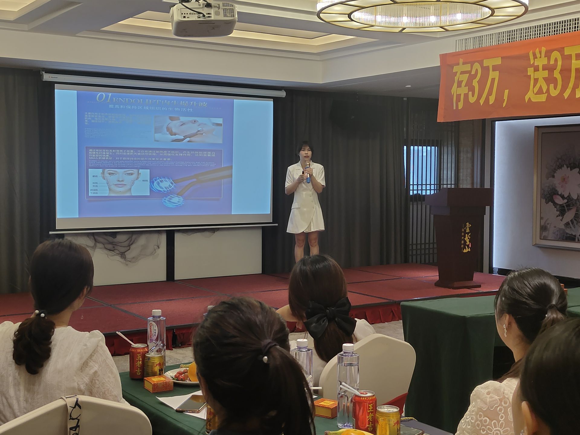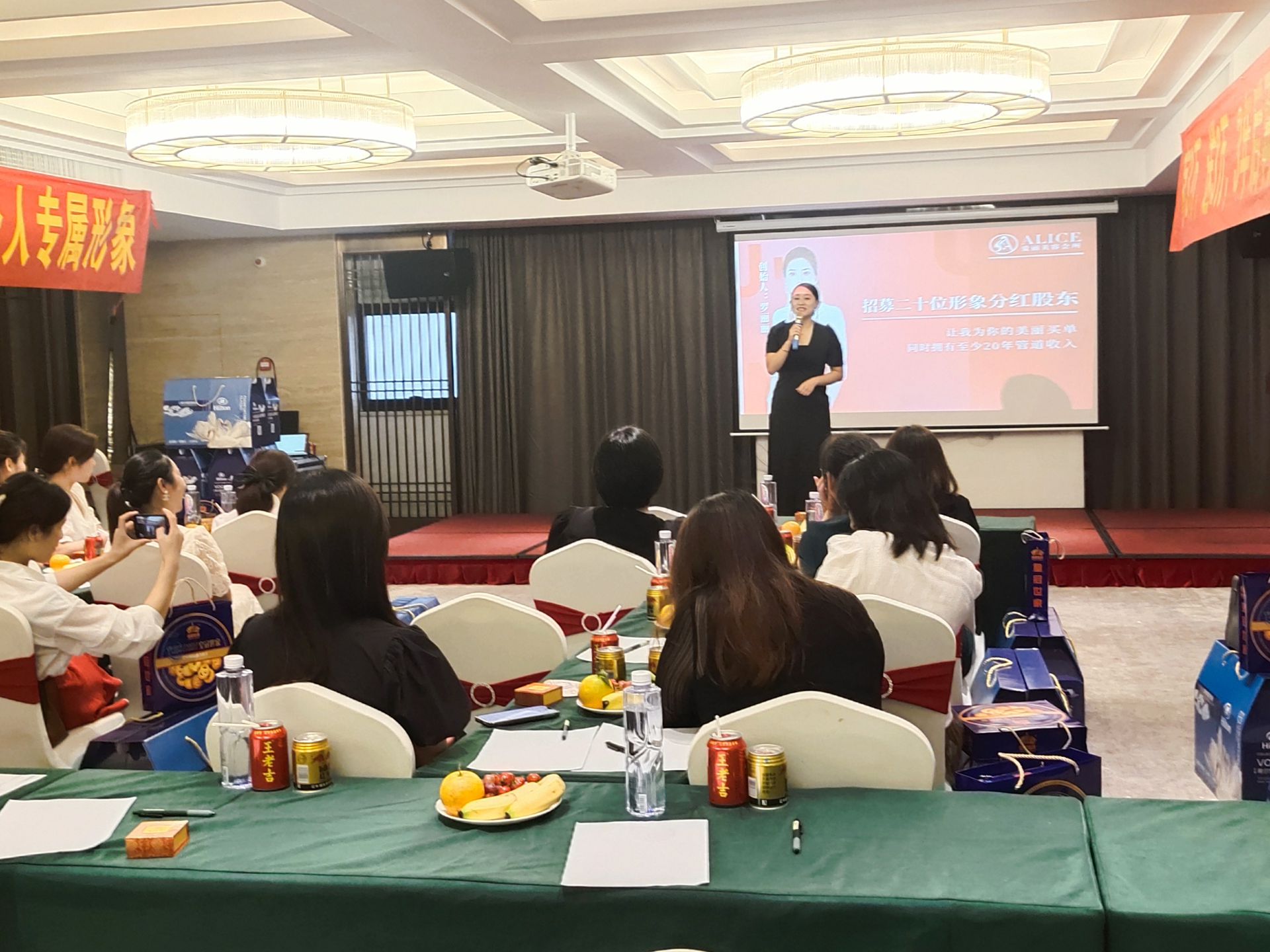 愛麗會所聯合創始人潘總上臺分享,介紹愛麗的相關品項及高端儀器,讓大家充分了解愛麗的特色與亮點,闡述了愛麗的實力和未來發展趨勢,贏得大家贊賞。