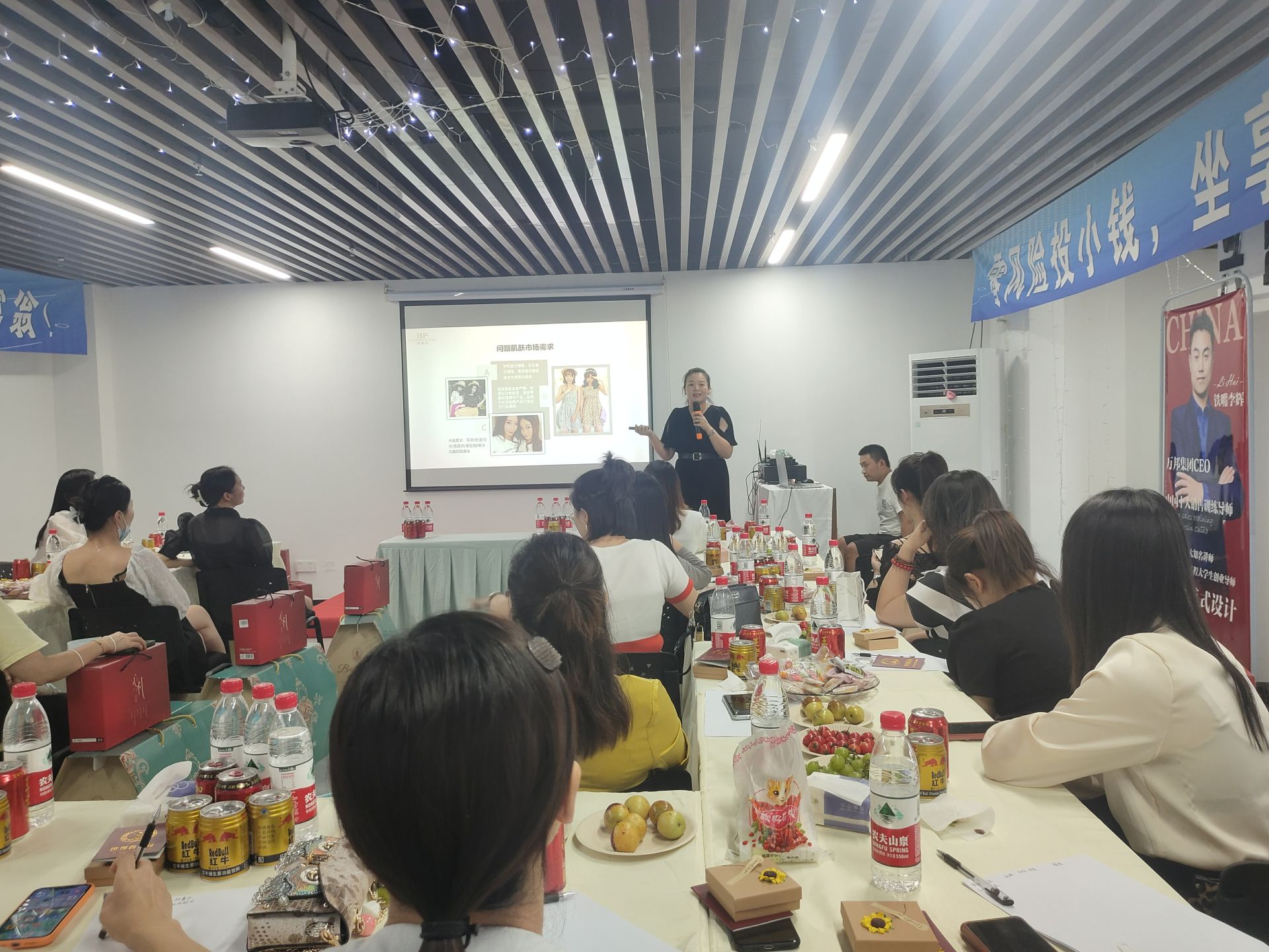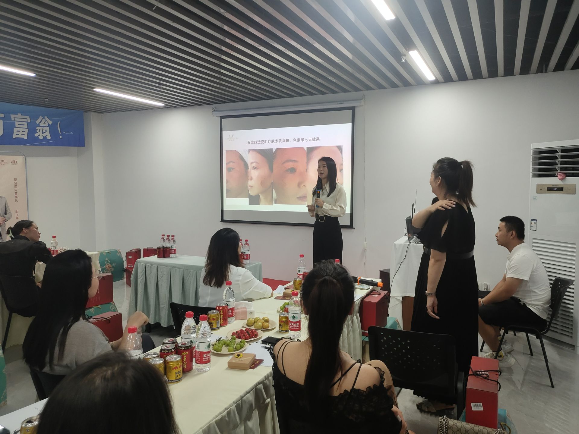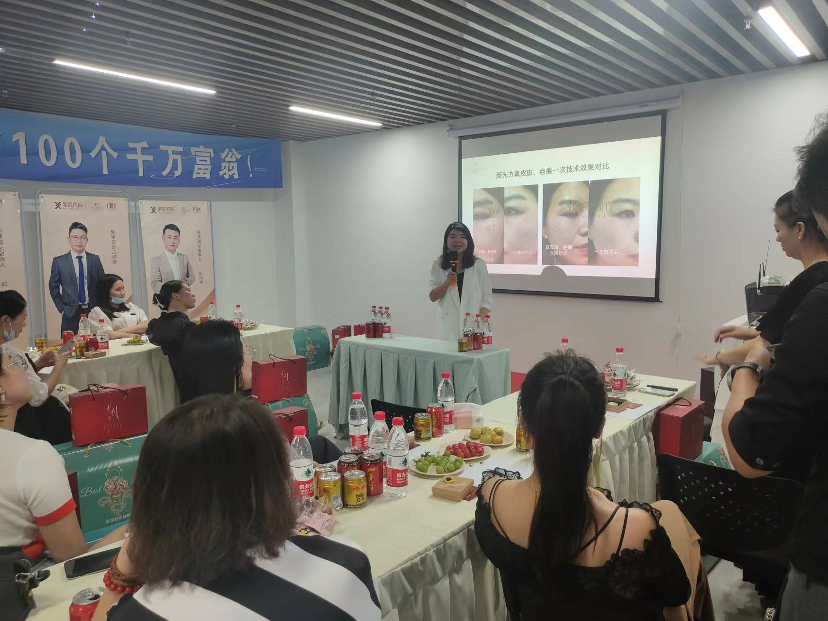 聚賢國(guó)際創(chuàng)始人朱總上臺(tái)分享產(chǎn)品的相關(guān)知識(shí),分享了當(dāng)前問題肌膚的市場(chǎng)前景、核心產(chǎn)品介紹及優(yōu)勢(shì)亮點(diǎn)等。現(xiàn)場(chǎng)還有客戶上臺(tái)分享自己蛻變的經(jīng)歷,讓大家看到了聚賢的實(shí)力和未來(lái)發(fā)展的前景。